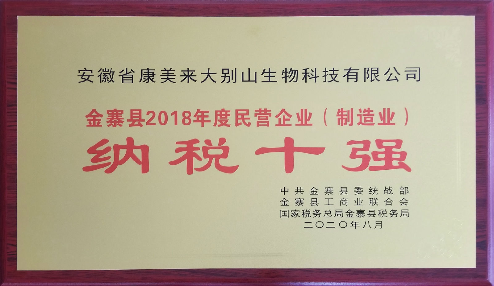 近日,中共金寨縣委統(tǒng)戰(zhàn)部、金寨縣工商業(yè)聯(lián)合會、國家稅務(wù)局金寨縣稅務(wù)局聯(lián)合開展了金寨縣民營企業(yè)納稅排序工作,依據(jù)注冊地在金寨縣的民營企業(yè)2018年度繳納的稅收實績,授予安徽省康美來大別山生物科技有限公司“金寨縣2018年度民營企業(yè)(制造業(yè))納稅十強”稱號。
