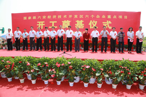 6月5日上午,國家級六安經(jīng)濟開發(fā)區(qū)隆重舉行六大重點企業(yè)項目開工奠基儀式,我公司六安新廠區(qū)項目系其中之一。六安市委書記孫云飛,市長畢小彬,市委常委常務副市長王勝,市委常委副市長付新安等市四套班子領導全部出席。