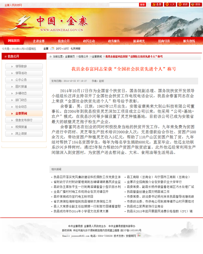 2014年10月10日,國務院扶貧開發領導小組辦公室官方網站發布國開發【2014】10號文件《國務院扶貧開發領導小組關于表彰全國社會扶貧先進集體和先進個人的決定》。國務院扶貧辦授予260人“全國社會扶貧先進個人”,其中安徽省8人獲得殊榮。