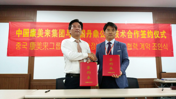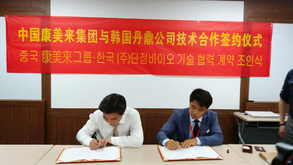 7月5日,余春富董事長代表中國康美來集團與大韓民國丹鼎生物科技有限公司董事長鄭義洙簽訂高端產(chǎn)品技術(shù)合作協(xié)議。