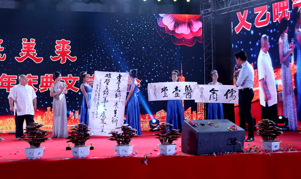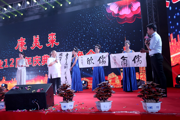 8月21日晚上,康美來12周年慶典文藝晚會在六安舉辦。著名表演藝術家、鄧小平特型演員盧奇親臨六安,登臺助陣,友情出演。“小平同志”認為康美來的事業是一個造福人民群眾健康幸福的崇高事業,是功德無量的事業,是響應黨中央、國務院“精準扶貧”的事業,帶領老區人民脫貧致富。他贊賞并鼓勵康美來扎根大別山敢闖敢冒的精神,號召大家大膽創業,為中國夢而奮斗!作為書法家的盧奇還現場提筆潑墨,書寫“康美來靈芝好”六個大字,字如其人,展現出書法功底,并贈送余春富董事長,慶賀康美來12周歲生日和集團成立。
