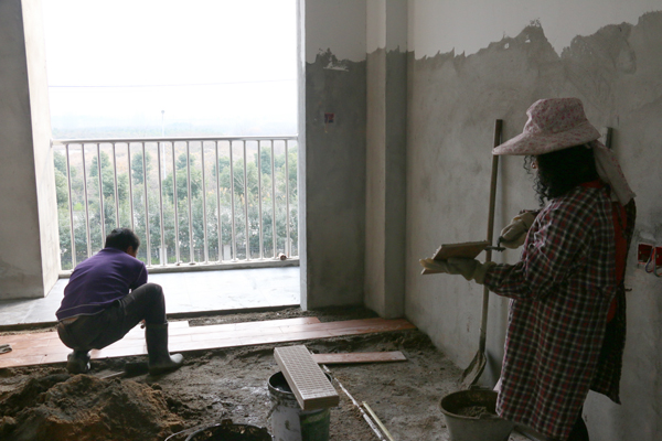 工人們正在鋪公寓樓地磚