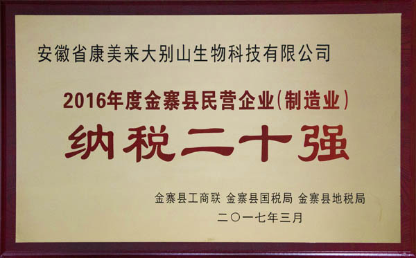 會議表彰安徽省康美來大別山生物科技有限公司“2016年度金寨縣民營企業(yè)納稅20強”并授牌。