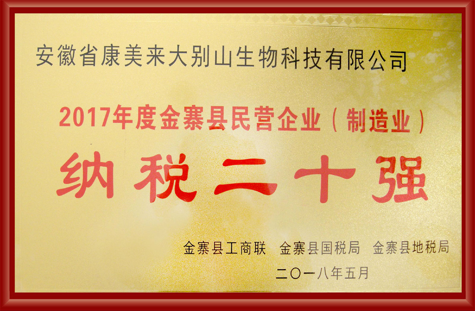 會議公布了金寨縣企業(yè)2017年度納稅排序活動結(jié)果,對納稅二十強企業(yè)進行了表彰頒獎,授予康美來“2017年度金寨縣民營企業(yè)(制造業(yè))納稅二十強”稱號,公司總裁助理尹維龍參會并上臺領獎。此獎項為康美來連續(xù)三年來納稅排序持續(xù)向前移位,且排序靠前。