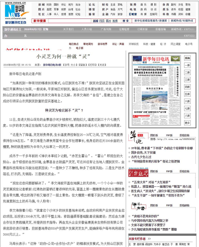 8月17日,新華社旗下平面報紙《新華每日電訊》主版刊發“小靈芝為何一種就靈”的記者文章,報道康美來公司大別山靈芝基地產業精準扶貧模式。