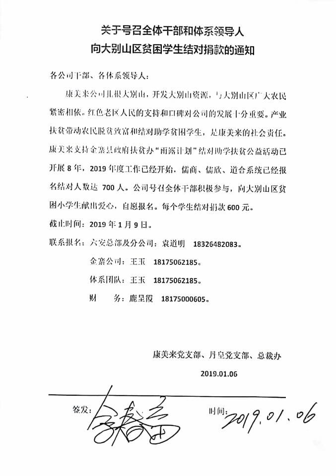 關于號召全體干部和體系領導人向大別山區貧困學生結對捐款的通知