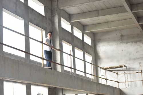 然后余董進入正在建設的第二幢廠房培訓中心。培訓中心鋼結構廠房目前正在墻面施工中,工人們正在壘磚砌墻。