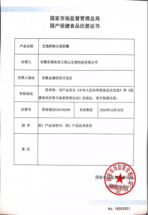 近日,國家市場監(jiān)督管理總局對于康美來公司申報的國產(chǎn)保健食品“芝蔻牌猴頭菇膠囊”批準注冊,注冊號為 國食健注G20190499。