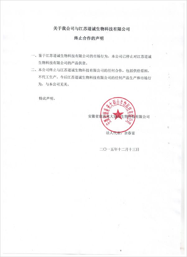 NCB訊:近日,新華商網(wǎng)記者于12月14日在安徽省康美來(lái)大別山生物科技有限公司官網(wǎng)發(fā)現(xiàn)其刊登了兩則與江蘇道誠(chéng)生物科技有限公司的聲明,第一條是終止與江蘇道誠(chéng)生物科技有限公司的合作聲明,另一條則是以金寨縣活力源食用菌種植專(zhuān)業(yè)合作社的名義發(fā)布的與江蘇道誠(chéng)生物科技有限公司無(wú)任何合作關(guān)系的聲明。新聞一前一后,可見(jiàn)安微省康美來(lái)大別山生物科技有限公司之前確與江蘇道誠(chéng)生物公司有合作關(guān)系,只因江蘇道誠(chéng)生物有限公司某些市場(chǎng)行為導(dǎo)致安微省康美來(lái)大別山生物科技有限公司決定停止對(duì)其的產(chǎn)品供貨以及不再代工生產(chǎn)。