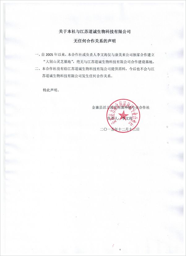 從第二則以金寨縣活力源食用菌種植專(zhuān)業(yè)合作社的名義發(fā)出的與江蘇道誠(chéng)生物公司無(wú)任何合作關(guān)系聲明中,了解到自2005年以來(lái),金寨縣活力源食用菌種植專(zhuān)業(yè)合作社負(fù)責(zé)人李文海僅僅是與康美來(lái)公司獨(dú)家合作建立“大別山靈芝基地”,并沒(méi)有與江蘇道誠(chéng)生物科技有限公司合作建設(shè)任何基地。同時(shí)聲明從沒(méi)有給江蘇道誠(chéng)生物公司提供過(guò)原料,今后也不會(huì)與江蘇道誠(chéng)生物公司發(fā)生任何合作關(guān)系。