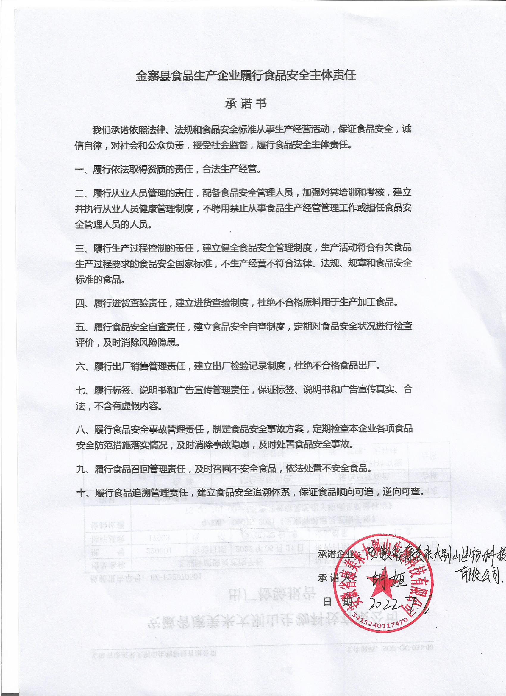 金寨縣食品生產企業履行食品安全主體責任承諾書